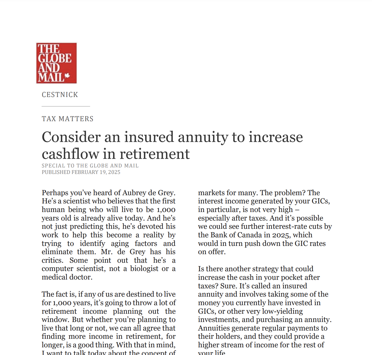 Is there another strategy that could increase the cash in your pocket after taxes? Sure. It’s called an insured annuity and involves taking some of the money you currently have invested in GICs, or other very low-yielding investments, and purchasing an annuity. Annuities generate regular payments to their holders, and they could provide a higher stream of income for the rest of your life.