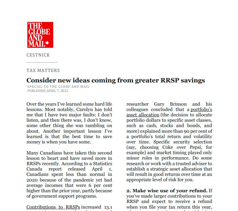 Many Canadians have taken this second lesson to heart and have saved more in RRSPs recently. According to a Statistics Canada report released April 1, Canadians spent less than normal in 2020 because of the pandemic yet had average incomes that were 6 per cent higher than the prior year, partly because of government support programs.