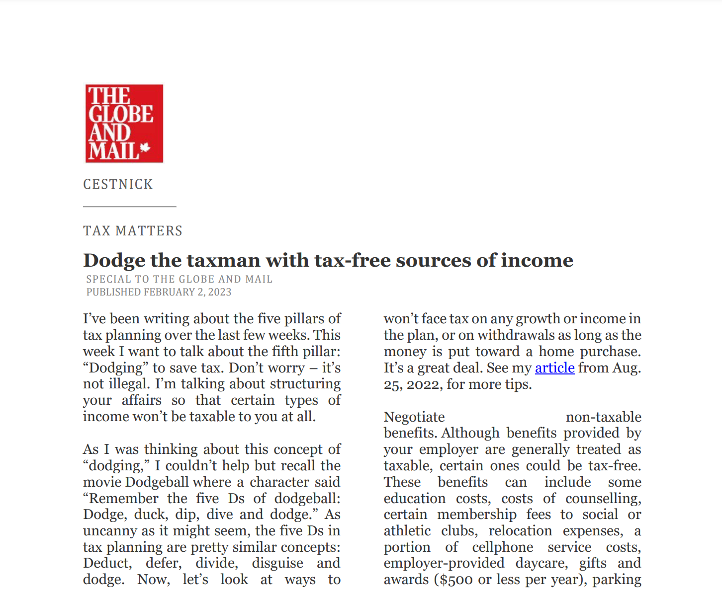 Catch up on our Co-Founder and CEO, Tim Cestnick's weekly column. His status as an expert is reinforced by his role as a tax and personal finance columnist for The Globe and Mail, Canada’s most prominent national newspaper.