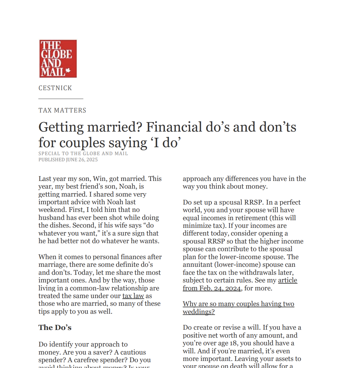 Catch up on our Co-Founder and CEO, Tim Cestnick's weekly column. His status as an expert is reinforced by his role as a tax and personal finance columnist for The Globe and Mail, Canada’s most prominent national newspaper.