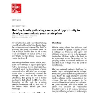 This is a story about a cottage. But it could just as well have been about other assets or estate plans more generally. This litigation and family strife could have been avoided if Margaret had communicated her intentions to the kids during her lifetime. Secrecy can only lead to problems. So, this holiday, consider having a conversation with the family about your own estate plans.