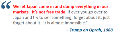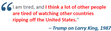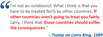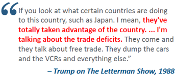 As far back as 1987 Donald Trump as a businessman, not a politician, has been consistent in his view towards tariffs as a tool in US trade policy, with the aim of reducing US trade deficits and opening up foreign markets to more US exports.