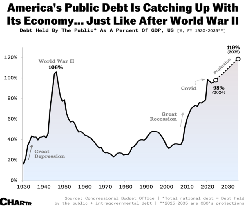 - The above chart shows the US public debt as a percentage of GDP, which is currently near the previous World War II high and projected to exceed that level in the near future.