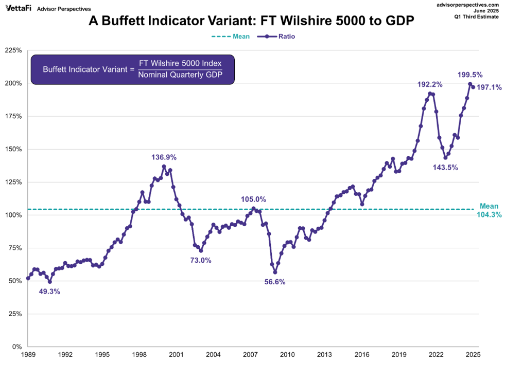 - As of June 2025 the Buffet Indicator is near its highest peak at 197.1%