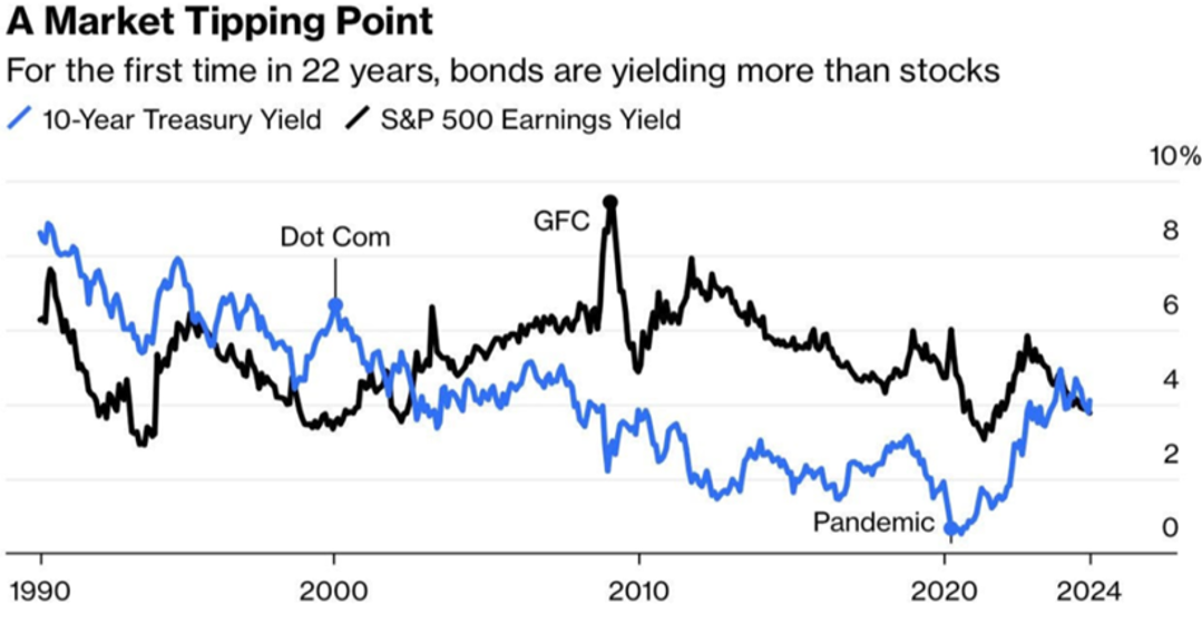 - The above chart shows the yield on 10-year treasury bonds and the earnings yield on the S&P 500 over the past 34 years.