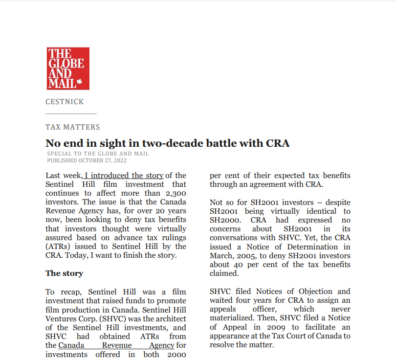 Last week, I introduced the story of the Sentinel Hill film investment that continues to affect more than 2,300 investors. The issue is that the Canada Revenue Agency has, for over 20 years now, been looking to deny tax benefits that investors thought were virtually assured based on advance tax rulings (ATRs) issued to Sentinel Hill by the CRA. Today, I want to finish the story.