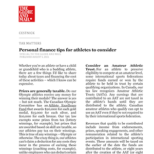 Consider an Amateur Athletic Trust. For an athlete to preserve eligibility to compete at an amateur level, some international sports federations require funds earned or won by the athlete to be held in trust by certain qualifying organizations. In Canada, our tax law recognizes Amateur Athletic Trusts (AATs). Any earnings that are contributed to an AAT are not taxed in the athlete’s hands until they are distributed to the athlete. Canadian amateur athletes who qualify can opt to use an AAT even if they’re not required to by their international sports federation.