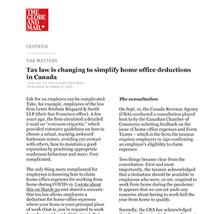 The CRA has already released a draft of new Form “T2200 Short” (a shortened version of Form T2200), which is supposed to make the tax compliance requirement easier. Neither the existing T2200 nor a proposed shorter version would have to be filed with your tax return if you claim home-office expenses, but you’re supposed to obtain a signed copy from your employer and keep it on hand in case the CRA wants to see it. (You can find a copy of the new draft form here.