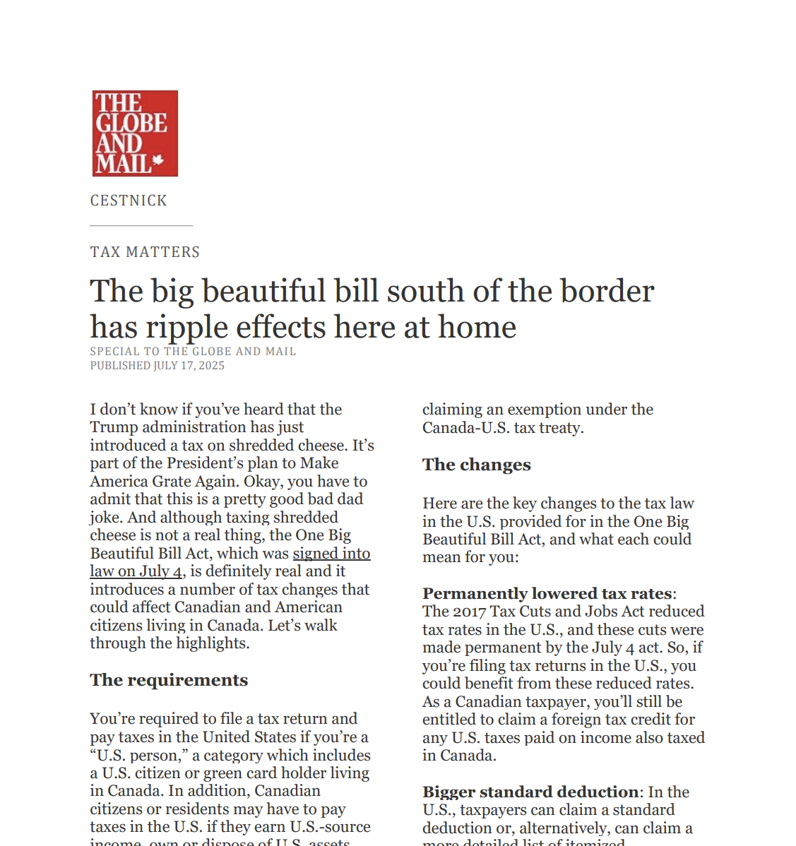 I don’t know if you’ve heard that the Trump administration has just introduced a tax on shredded cheese. It’s part of the President’s plan to Make America Grate Again. Okay, you have to admit that this is a pretty good bad dad joke. And although taxing shredded cheese is not a real thing, the One Big Beautiful Bill Act, which was signed into law on July 4, is definitely real and it introduces a number of tax changes that could affect Canadian and American citizens living in Canada. Let’s walk through the highlights.