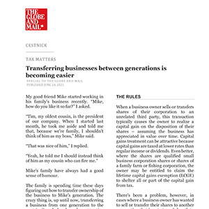 The family is spending time these days figuring out how to transfer ownership of the business to Mike’s generation. The crazy thing is, up until now, transferring a business from one generation to the next in Canada has been less attractive from a tax point of view than selling the business to an unrelated third party. But things are changing.
