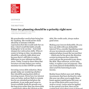 Making your interest deductible. Do you have any debt with non-deductible interest? If so, consider liquidating some of your investments outside of your registered plans (count the tax cost first – which may be low given the direction certain investments have taken this year) and use the proceeds to pay down the debt. Then reborrow, at low rates today, to replace your investments. This can create interest deductibility for 2021 since you’ll be borrowing to earn income.