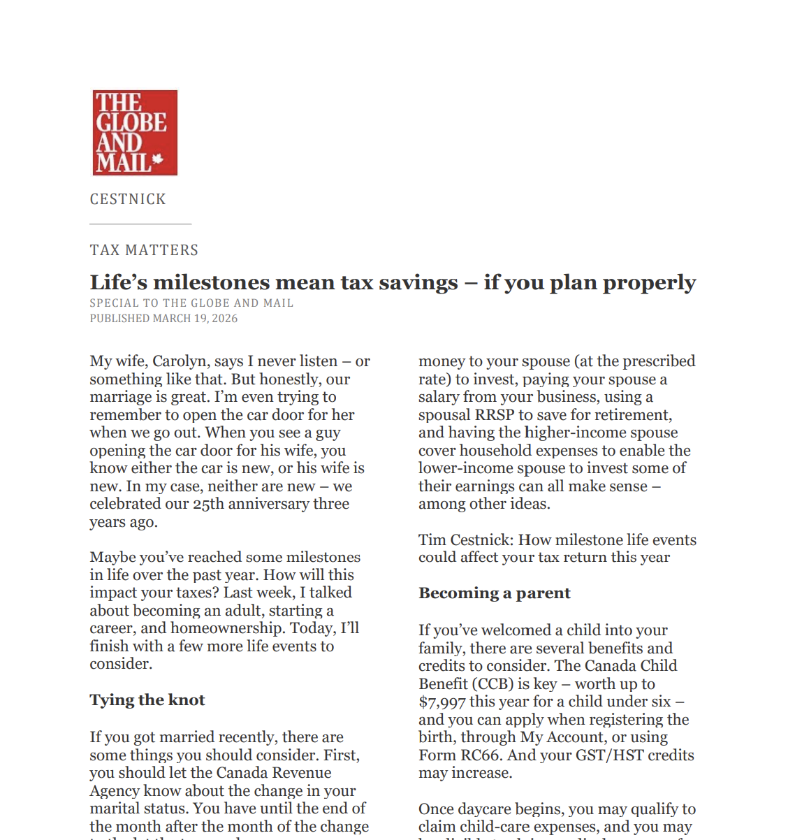 Tim Cestnick’s Globe & Mail Articles