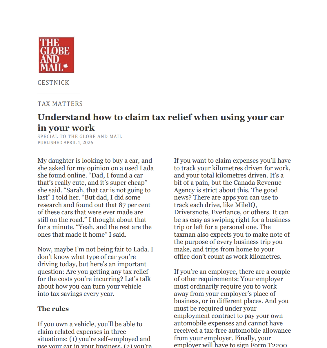 Catch up on our Co-Founder and CEO, Tim Cestnick's weekly column. His status as an expert is reinforced by his role as a tax and personal finance columnist for The Globe and Mail, Canada’s most prominent national newspaper.