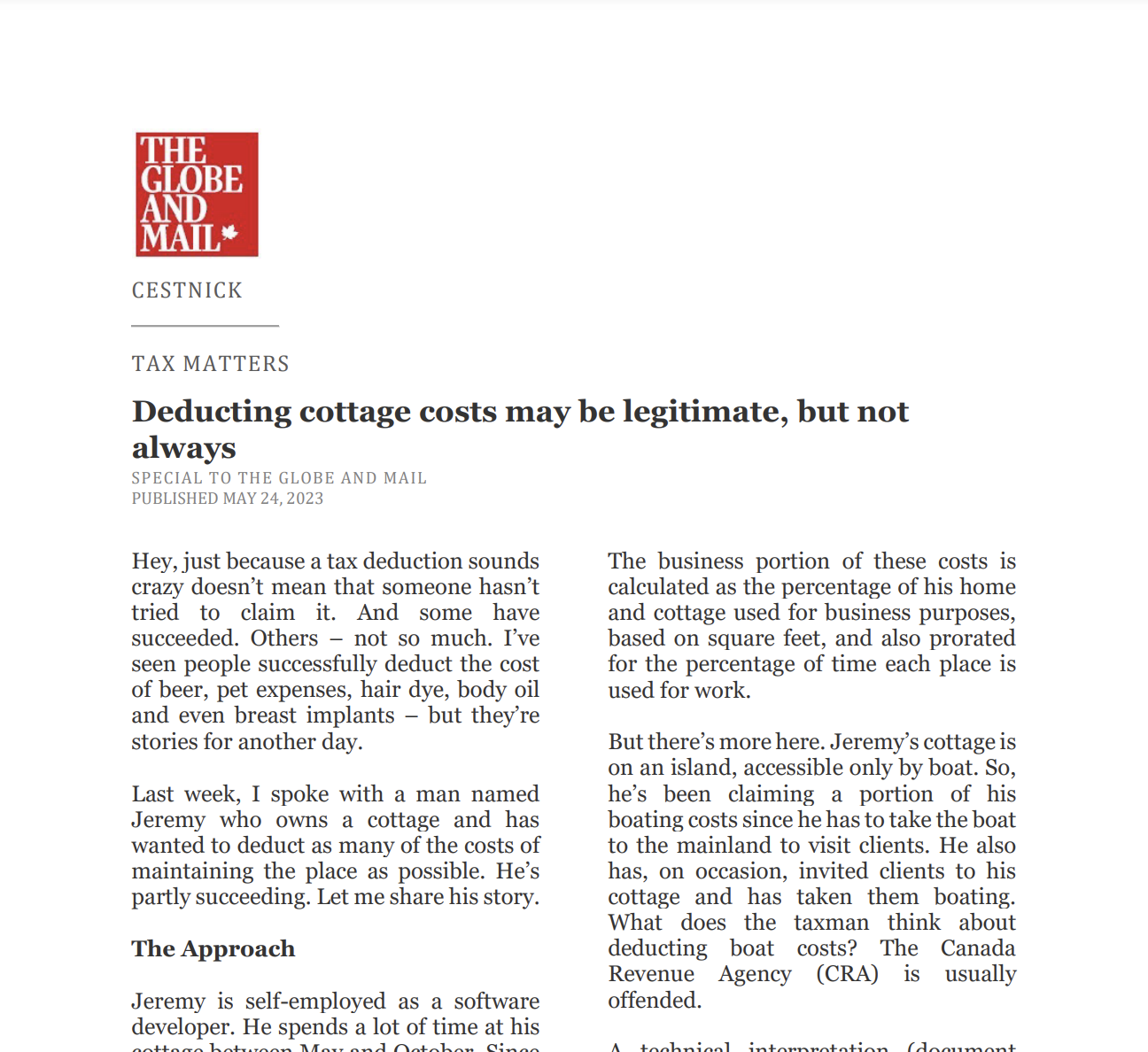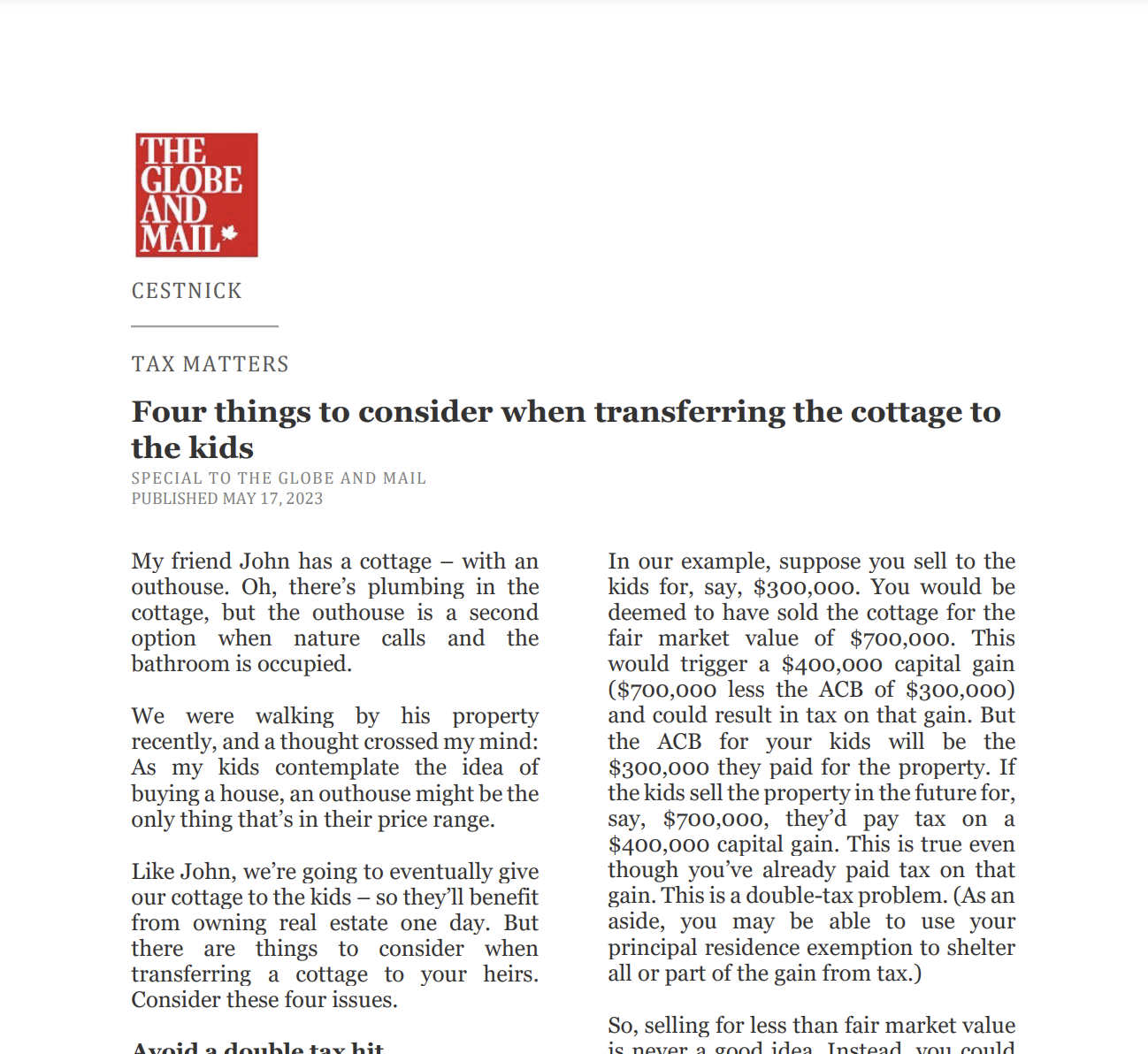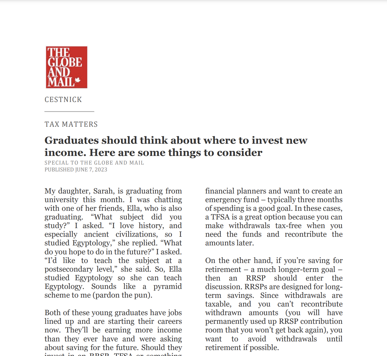 Catch up on our Co-Founder and CEO, Tim Cestnick's weekly column. His status as an expert is reinforced by his role as a tax and personal finance columnist for The Globe and Mail, Canada’s most prominent national newspaper.