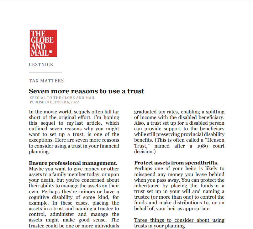 Catch up on our Co-Founder and CEO, Tim Cestnick's weekly column. His status as an expert is reinforced by his role as a tax and personal finance columnist for The Globe and Mail, Canada’s most prominent national newspaper.