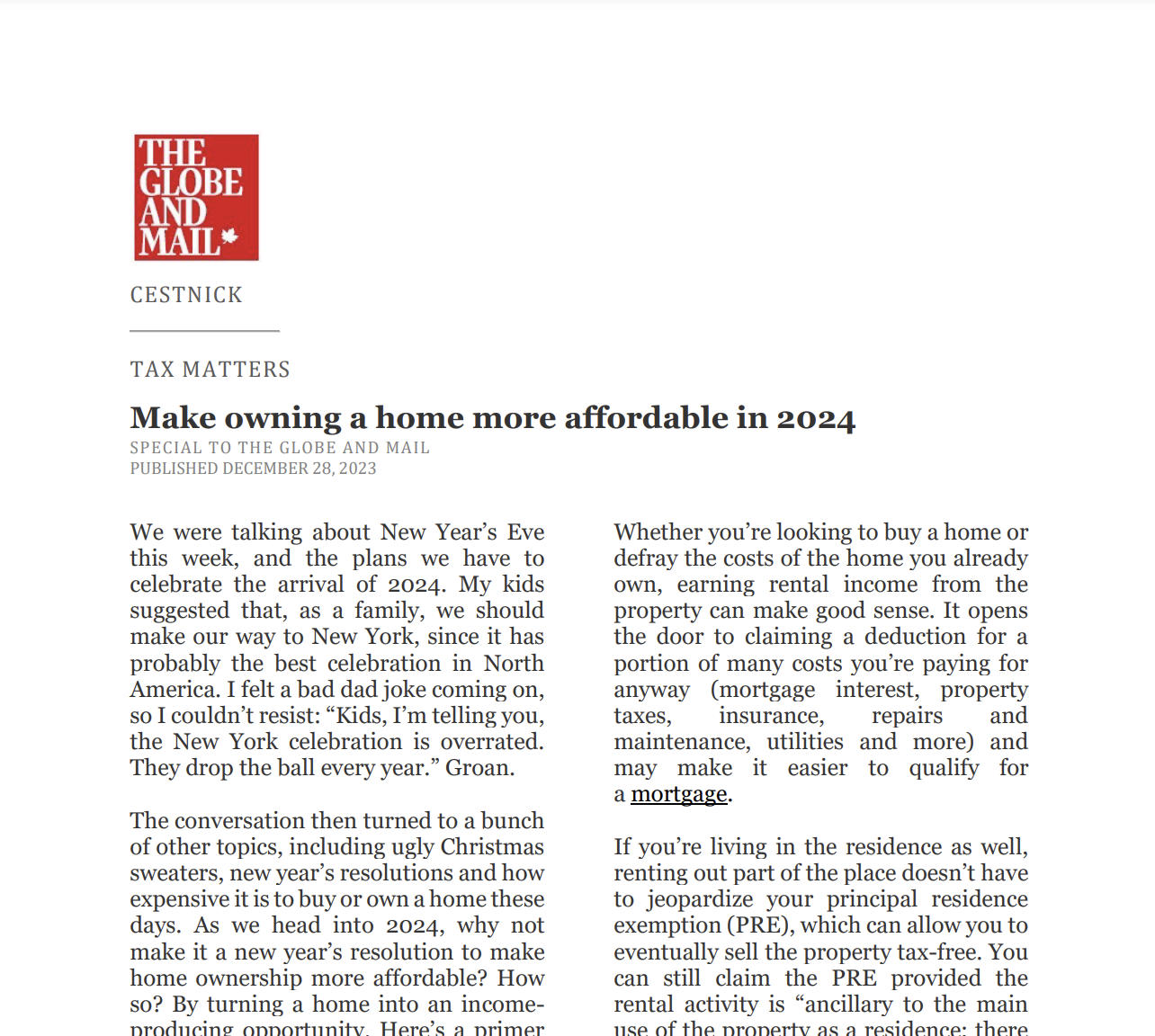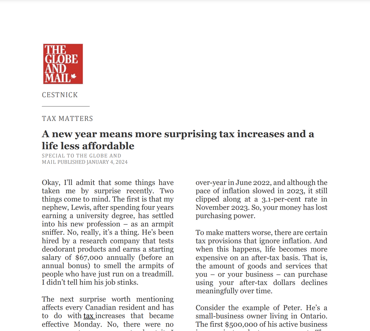 Catch up on our Co-Founder and CEO, Tim Cestnick's weekly column. His status as an expert is reinforced by his role as a tax and personal finance columnist for The Globe and Mail, Canada’s most prominent national newspaper.