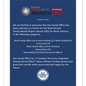 Our Family Office Inc., WINNER for Best Multi-Family Office in North America (up to and including US $2.5 billion AuM/AuA)